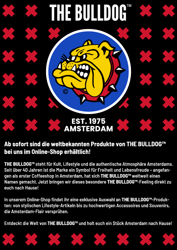 The Bulldog™ steht für Kult, Lifestyle und die authentische Atmosphäre Amsterdams. Seit über 40 Jahren ist die Marke ein Symbol für Freiheit und Lebensfreude – angefangen als erster Coffeeshop in Amsterdam, hat sich The bulldog™ weltweit einen Namen gemacht. Jetzt bringen wir dieses besondere the Bulldog™-Feeling direkt zu euch nach Hause!